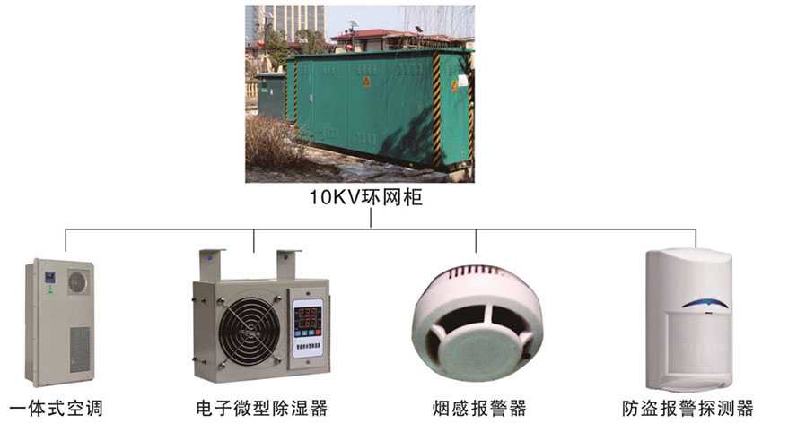 環(huán)網(wǎng)柜制冷濕管理系統(tǒng)主要由一體式空調(diào)(定制)、電子式微型除濕器,防盜煙感報警、煙霧探測器四個部分組成,所有設(shè)備均有安裝在環(huán)網(wǎng)柜內(nèi)部,實現(xiàn)環(huán)網(wǎng)柜的溫度測量控制。每套環(huán)網(wǎng)柜除濕管理系統(tǒng)包含一體式空調(diào)1套,電子式微型除濕器2臺,防盜煙感器1只,煙霧傳感器1只;經(jīng)過改造后的系統(tǒng)組成示意圖如下圖所示: